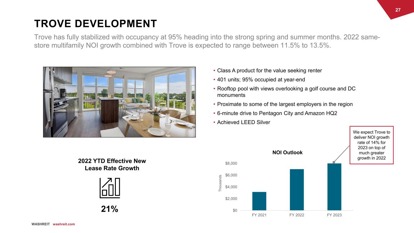 27 WASHREIT washreit.com • Class A product for the value seeking renter • 401 units; 95% occupied at year-end • Rooftop pool with views overlooking a golf course and DC monuments • Proximate to some of the largest employers in the region • 6-minute drive to Pentagon City and Amazon HQ2 • Achieved LEED Silver TROVE DEVELOPMENT Trove has fully stabilized with occupancy at 95% heading into the strong spring and summer months. 2022 same- store multifamily NOI growth combined with Trove is expected to range between 11.5% to 13.5%. $0 $2,000 $4,000 $6,000 $8,000 FY 2021 FY 2022 FY 2023 Th ou sa nd s NOI Outlook 21% 2022 YTD Effective New Lease Rate Growth We expect Trove to deliver NOI growth rate of 14% for 2023 on top of much greater growth in 2022