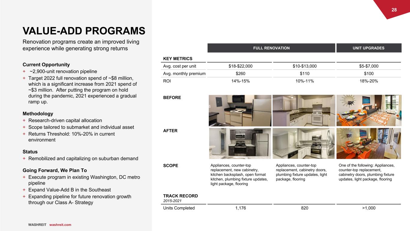 28 WASHREIT washreit.com VALUE-ADD PROGRAMS FULL RENOVATION KEY METRICS Avg. cost per unit $18-$22,000 $10-$13,000 $5-$7,000 Avg. monthly premium $260 $110 $100 ROI 14%-15% 10%-11% 18%-20% BEFORE UNIT UPGRADES Current Opportunity + ~2,900-unit renovation pipeline + Target 2022 full renovation spend of ~$8 million, which is a significant increase from 2021 spend of ~$3 million. After putting the program on hold during the pandemic, 2021 experienced a gradual ramp up. Methodology + Research-driven capital allocation + Scope tailored to submarket and individual asset + Returns Threshold: 10%-20% in current environment Status + Remobilized and capitalizing on suburban demand Going Forward, We Plan To + Execute program in existing Washington, DC metro pipeline + Expand Value-Add B in the Southeast + Expanding pipeline for future renovation growth through our Class A- Strategy SCOPE Appliances, counter-top replacement, new cabinetry, kitchen backsplash, open format kitchen, plumbing fixture updates, light package, flooring Appliances, counter-top replacement, cabinetry doors, plumbing fixture updates, light package, flooring One of the following: Appliances, counter-top replacement, cabinetry doors, plumbing fixture updates, light package, flooring TRACK RECORD 2015-2021 Units Completed 1,176 820 >1,000 AFTER Renovation programs create an improved living experience while generating strong returns WASHREIT washreit.com