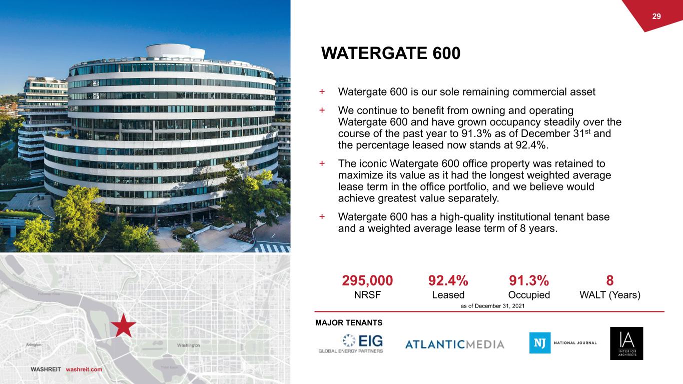 29 WASHREIT washreit.com ACCENT IMAGE Place and image in this space. Resize and use the crop tool to fit on top of this box. + Watergate 600 is our sole remaining commercial asset + We continue to benefit from owning and operating Watergate 600 and have grown occupancy steadily over the course of the past year to 91.3% as of December 31st and the percentage leased now stands at 92.4%. + The iconic Watergate 600 office property was retained to maximize its value as it had the longest weighted average lease term in the office portfolio, and we believe would achieve greatest value separately. + Watergate 600 has a high-quality institutional tenant base and a weighted average lease term of 8 years. 295,000 NRSF 91.3% Occupied 8 WALT (Years) 92.4% Leased as of December 31, 2021 MAJOR TENANTS WASHREIT washreit.com WATERGATE 600