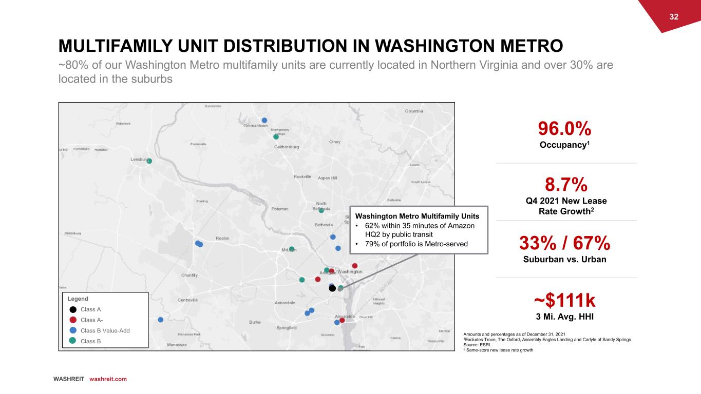 31 WASHREIT washreit.com Note: Refer to slide 2 for certain disclosures regarding Forward-Looking Statements. 1 For multifamily buildings, ending occupancy based on units. For Watergate 600, ending occupancy based on square feet that includes temporary lease agreements. As of December 31, 2021 Properties Location Class Units NRSF (000s) % Occupied1 Clayborne Alexandria, VA A- 74 60 97.3% Riverside Apartments Alexandria, VA B Value-Add 1,222 1,001 95.3% Assembly Alexandria Alexandria, VA B Value-Add 532 437 95.9% Cascade at Landmark Alexandria, VA B Value-Add 277 273 96.8% Park Adams Arlington, VA B 200 173 95.5% Bennett Park Arlington, VA A- 224 215 96.4% The Maxwell Arlington, VA A- 163 116 96.3% The Paramount Arlington, VA B 135 141 95.6% The Wellington Arlington, VA B Value-Add 711 600 96.3% Trove Arlington, VA A 401 293 94.5% Roosevelt Towers Falls Church, VA B 191 170 94.8% The Ashby at McLean McLean, VA B 256 274 95.7% Assembly Dulles Herndon, VA B Value-Add 328 361 95.4% Assembly Herndon Herndon, VA B Value-Add 283 221 95.8% Assembly Manassas Manassas, VA B Value-Add 408 390 95.3% Assembly Leesburg Leesburg, VA B 134 124 98.5% Bethesda Hill Apartments Bethesda, MD B 195 225 95.9% Assembly Germantown Germantown, MD B Value-Add 218 211 96.3% Assembly Watkins Mill Gaithersburg, MD B 210 193 98.6% 3801 Connecticut Avenue Washington, DC B Value-Add 307 178 97.1% Kenmore Apartments Washington, DC B Value-Add 374 268 94.9% Yale West Washington, DC A- 216 173 96.3% The Oxford Conyers, GA B 240 273 95.0% Assembly Eagles Landing Stockbridge, GA B 490 534 95.7% Carlyle at Sandy Springs Sandy Springs, GA B Value-Add 389 506 N/A Total // Stabilized Multifamily Properties 8,178 7,410 95.8% Watergate 600 Washington, DC – – 295 91.3% Class A- Generally, 100%-110% of median market rents Total Multifamily 96% Class A, Class A-, Class B Value-Add, and Class B strategies together comprise 96% of WashREIT’s NRSF Class B Rents are generally in the 80%-95% of market range Watergate 600 295k SF office building in Washington, DC Strategy Diversification Percentage of NRSF 27% 4% 7% Class B Value-Add Generally, pre-renovation rents are 80%-95% of median market rents 58% MULTIFAMILY PORTFOLIO COMPOSITION Class A Generally, >120% of median market rents 4%