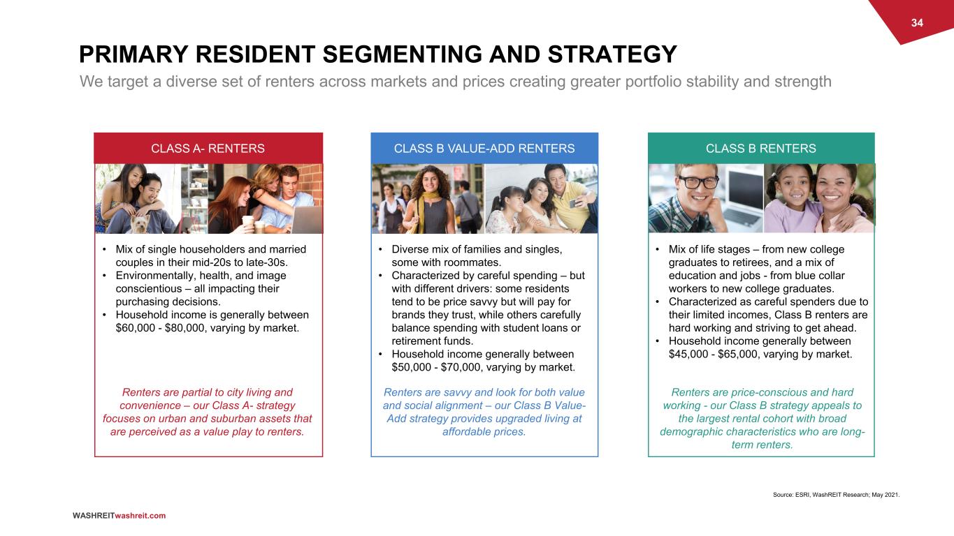 34 WASHREITwashreit.com CLASS A- RENTERS CLASS B VALUE-ADD RENTERS CLASS B RENTERS • Mix of single householders and married couples in their mid-20s to late-30s. • Environmentally, health, and image conscientious – all impacting their purchasing decisions. • Household income is generally between $60,000 - $80,000, varying by market. • Diverse mix of families and singles, some with roommates. • Characterized by careful spending – but with different drivers: some residents tend to be price savvy but will pay for brands they trust, while others carefully balance spending with student loans or retirement funds. • Household income generally between $50,000 - $70,000, varying by market. • Mix of life stages – from new college graduates to retirees, and a mix of education and jobs - from blue collar workers to new college graduates. • Characterized as careful spenders due to their limited incomes, Class B renters are hard working and striving to get ahead. • Household income generally between $45,000 - $65,000, varying by market. Renters are partial to city living and convenience – our Class A- strategy focuses on urban and suburban assets that are perceived as a value play to renters. Renters are savvy and look for both value and social alignment – our Class B Value- Add strategy provides upgraded living at affordable prices. Renters are price-conscious and hard working - our Class B strategy appeals to the largest rental cohort with broad demographic characteristics who are long- term renters. Source: ESRI, WashREIT Research; May 2021. PRIMARY RESIDENT SEGMENTING AND STRATEGY We target a diverse set of renters across markets and prices creating greater portfolio stability and strength