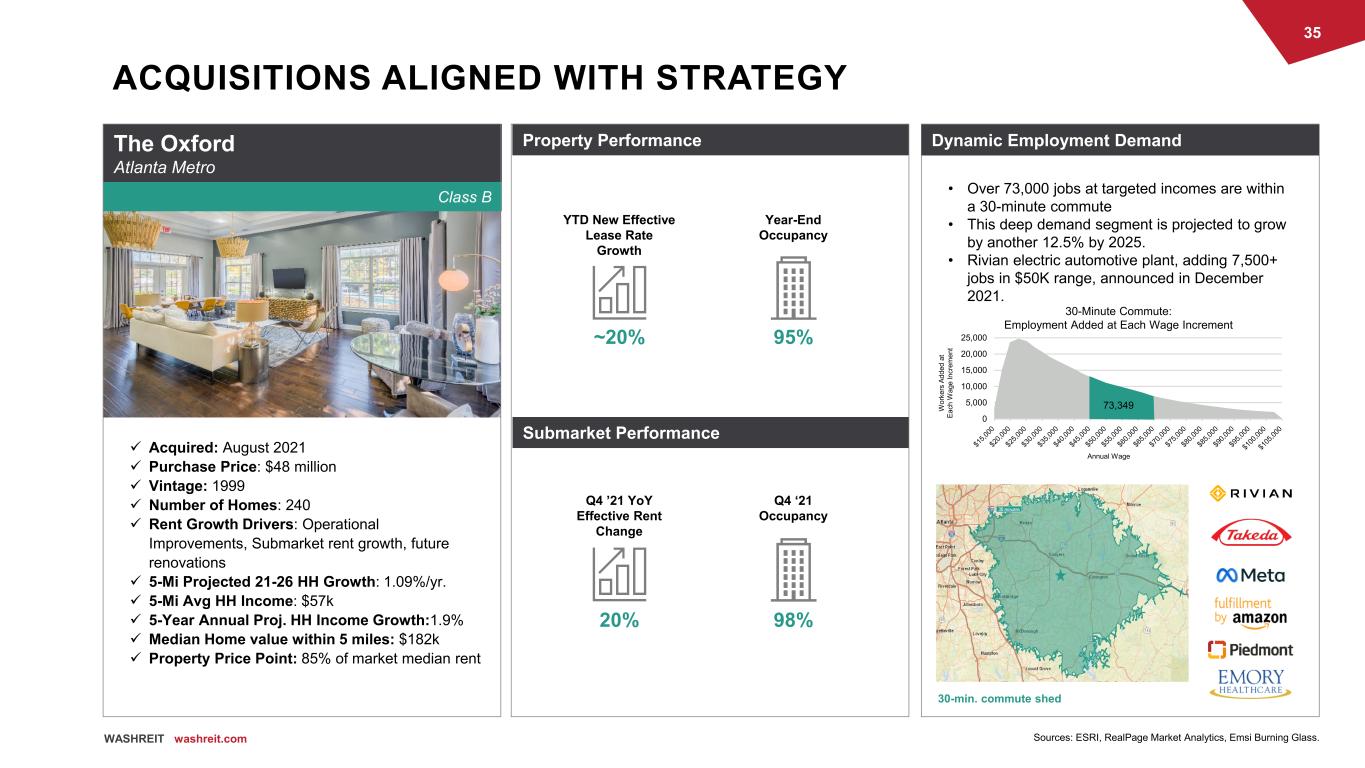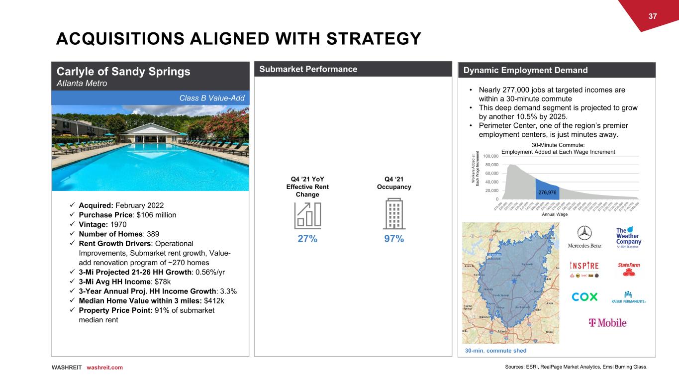36 WASHREIT washreit.com ACQUISITIONS ALIGNED WITH STRATEGY Acquired: November 2021 Purchase Price: $106 million Vintage: 1997, 2000 Number of Homes: 490 Rent Growth Drivers: Operational Improvements, Submarket rent growth, future renovations 5-Mi Projected 21-26 HH Growth: 1.26%/yr. 5-Mi Avg HH Income: $67k 5-Year Annual Proj. HH Income Growth: 2.0% Median Home value within 5 miles: $195k Property Price Point: 85% of market median rent Dynamic Employment Demand • Over 98,000 jobs at targeted incomes are within a 30-minute commute • This deep demand segment is projected to grow by another 11.8% by 2025. • Henry County, GA is the epicenter of logistics- related job growth in the Atlanta region. 30-min. commute shed W or ke rs A dd ed a t Ea ch W ag e In cr em en t Annual Wage YTD New Effective Lease Rate Growth Property Performance Submarket Performance 22% Year-End Occupancy 95.7% Q4 ’21 YoY Effective Rent Change 22% Q4 ‘21 Occupancy 97.0% Assembly Eagles Landing Atlanta Metro Class B Sources: ESRI, RealPage Market Analytics, Emsi Burning Glass. 30-Minute Commute: Employment Added at Each Wage Increment - 5,000 10,000 15,000 20,000 25,000 30,000 35,000 98,064