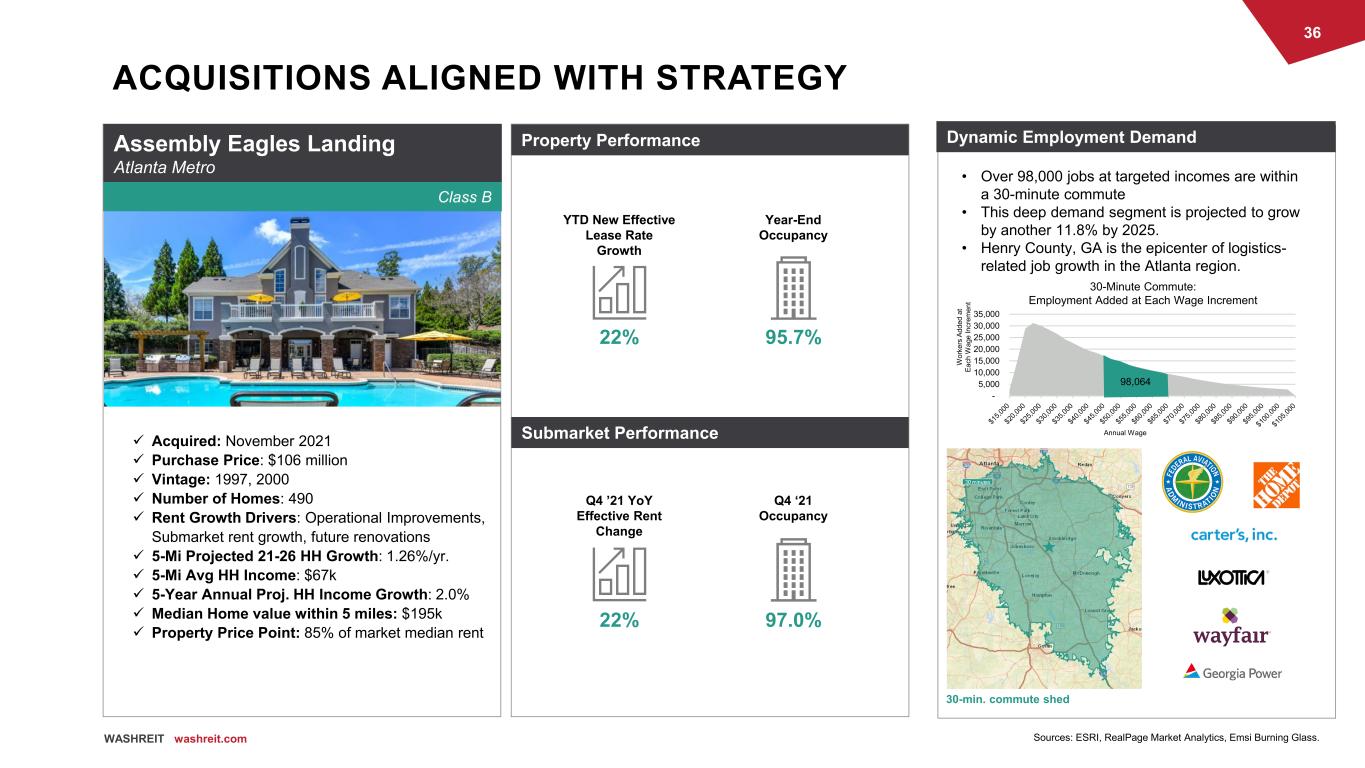 35 WASHREIT washreit.com ACQUISITIONS ALIGNED WITH STRATEGY The Oxford Atlanta Metro Class B Acquired: August 2021 Purchase Price: $48 million Vintage: 1999 Number of Homes: 240 Rent Growth Drivers: Operational Improvements, Submarket rent growth, future renovations 5-Mi Projected 21-26 HH Growth: 1.09%/yr. 5-Mi Avg HH Income: $57k 5-Year Annual Proj. HH Income Growth:1.9% Median Home value within 5 miles: $182k Property Price Point: 85% of market median rent Dynamic Employment Demand • Over 73,000 jobs at targeted incomes are within a 30-minute commute • This deep demand segment is projected to grow by another 12.5% by 2025. • Rivian electric automotive plant, adding 7,500+ jobs in $50K range, announced in December 2021. 30-min. commute shed Sources: ESRI, RealPage Market Analytics, Emsi Burning Glass. YTD New Effective Lease Rate Growth Property Performance Submarket Performance ~20% Year-End Occupancy 95% Q4 ’21 YoY Effective Rent Change 20% Q4 ‘21 Occupancy 98% W or ke rs A dd ed a t Ea ch W ag e In cr em en t 30-Minute Commute: Employment Added at Each Wage Increment 0 5,000 10,000 15,000 20,000 25,000 Annual Wage 73,349