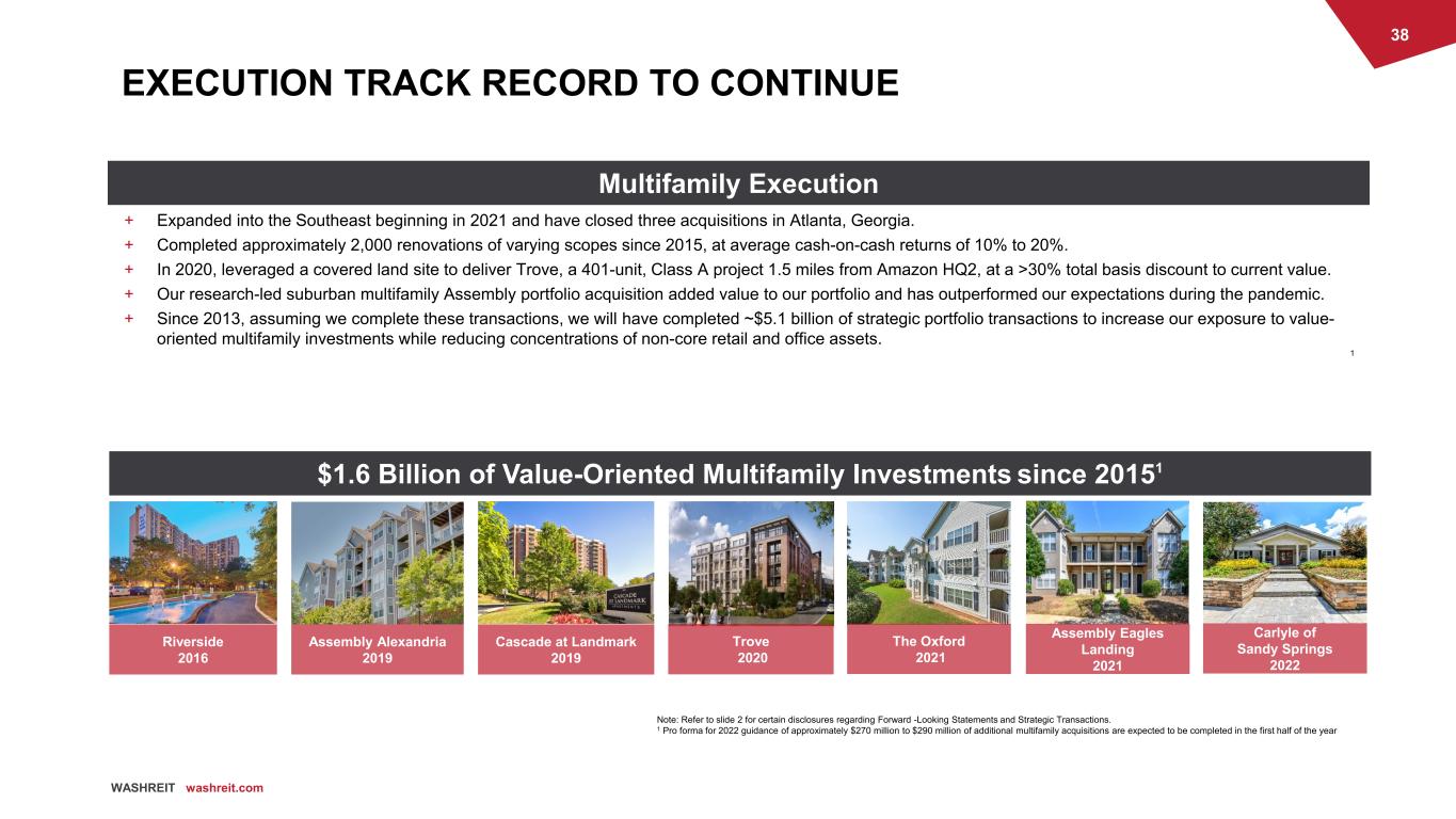 38 WASHREIT washreit.com $1.6 Billion of Value-Oriented Multifamily Investments since 20151 + Expanded into the Southeast beginning in 2021 and have closed three acquisitions in Atlanta, Georgia. + Completed approximately 2,000 renovations of varying scopes since 2015, at average cash-on-cash returns of 10% to 20%. + In 2020, leveraged a covered land site to deliver Trove, a 401-unit, Class A project 1.5 miles from Amazon HQ2, at a >30% total basis discount to current value. + Our research-led suburban multifamily Assembly portfolio acquisition added value to our portfolio and has outperformed our expectations during the pandemic. + Since 2013, assuming we complete these transactions, we will have completed ~$5.1 billion of strategic portfolio transactions to increase our exposure to value- oriented multifamily investments while reducing concentrations of non-core retail and office assets. Note: Refer to slide 2 for certain disclosures regarding Forward -Looking Statements and Strategic Transactions. 1 Pro forma for 2022 guidance of approximately $270 million to $290 million of additional multifamily acquisitions are expected to be completed in the first half of the year 1 EXECUTION TRACK RECORD TO CONTINUE Trove 2020 Riverside 2016 Assembly Alexandria 2019 Cascade at Landmark 2019 The Oxford 2021 Assembly Eagles Landing 2021 Carlyle of Sandy Springs 2022 Multifamily Execution