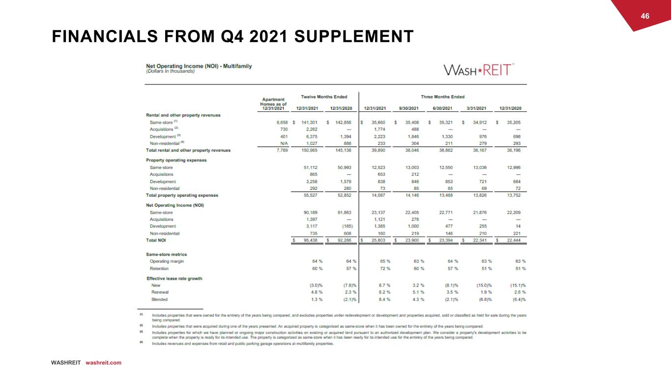 45 WASHREIT washreit.com 1) For a list of non same-store, discontinued operations and other properties, see “Same-Store Portfolio Net Operating Income (NOI) Growth 2021 vs 2020” FINANCIALS FROM Q4 2021 SUPPLEMENT