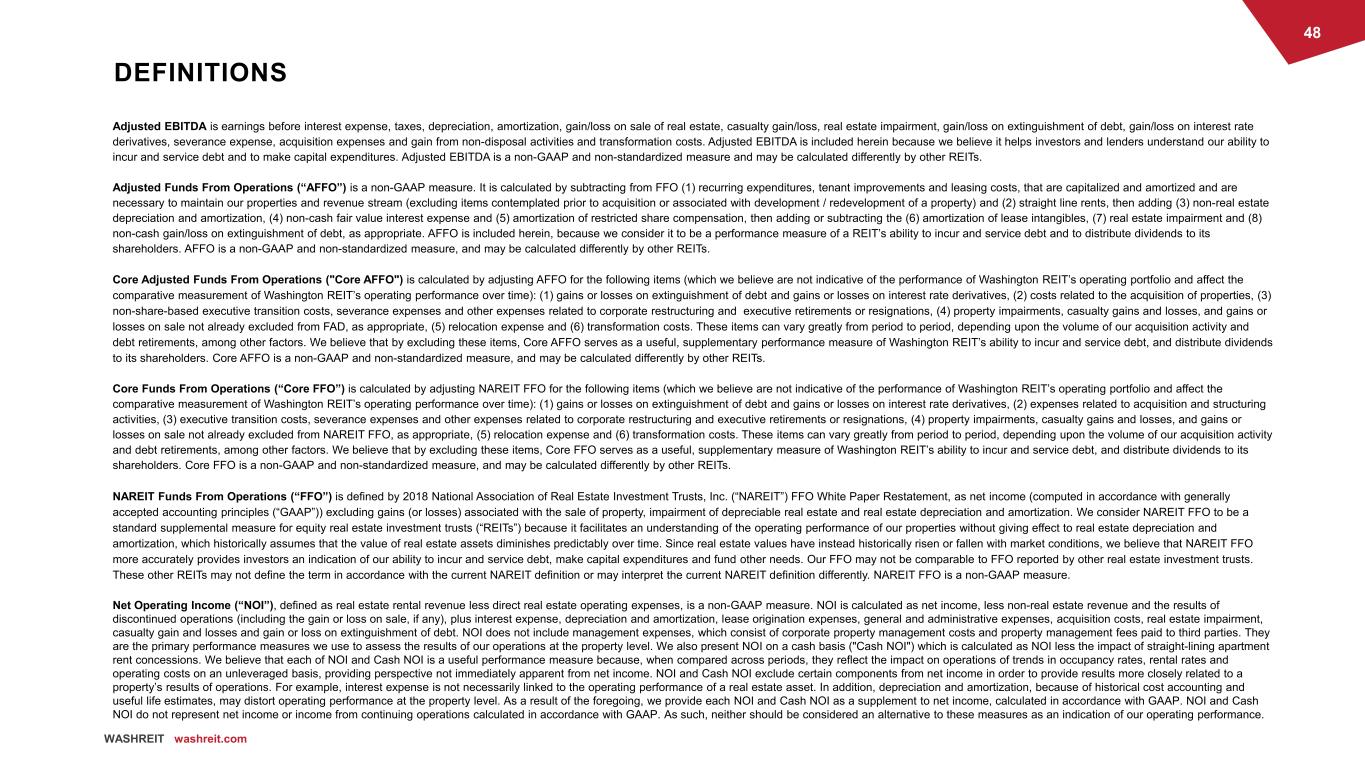 48 WASHREIT washreit.com DEFINITIONS Adjusted EBITDA is earnings before interest expense, taxes, depreciation, amortization, gain/loss on sale of real estate, casualty gain/loss, real estate impairment, gain/loss on extinguishment of debt, gain/loss on interest rate derivatives, severance expense, acquisition expenses and gain from non-disposal activities and transformation costs. Adjusted EBITDA is included herein because we believe it helps investors and lenders understand our ability to incur and service debt and to make capital expenditures. Adjusted EBITDA is a non-GAAP and non-standardized measure and may be calculated differently by other REITs. Adjusted Funds From Operations (“AFFO”) is a non-GAAP measure. It is calculated by subtracting from FFO (1) recurring expenditures, tenant improvements and leasing costs, that are capitalized and amortized and are necessary to maintain our properties and revenue stream (excluding items contemplated prior to acquisition or associated with development / redevelopment of a property) and (2) straight line rents, then adding (3) non-real estate depreciation and amortization, (4) non-cash fair value interest expense and (5) amortization of restricted share compensation, then adding or subtracting the (6) amortization of lease intangibles, (7) real estate impairment and (8) non-cash gain/loss on extinguishment of debt, as appropriate. AFFO is included herein, because we consider it to be a performance measure of a REIT’s ability to incur and service debt and to distribute dividends to its shareholders. AFFO is a non-GAAP and non-standardized measure, and may be calculated differently by other REITs. Core Adjusted Funds From Operations ("Core AFFO") is calculated by adjusting AFFO for the following items (which we believe are not indicative of the performance of Washington REIT’s operating portfolio and affect the comparative measurement of Washington REIT’s operating performance over time): (1) gains or losses on extinguishment of debt and gains or losses on interest rate derivatives, (2) costs related to the acquisition of properties, (3) non-share-based executive transition costs, severance expenses and other expenses related to corporate restructuring and executive retirements or resignations, (4) property impairments, casualty gains and losses, and gains or losses on sale not already excluded from FAD, as appropriate, (5) relocation expense and (6) transformation costs. These items can vary greatly from period to period, depending upon the volume of our acquisition activity and debt retirements, among other factors. We believe that by excluding these items, Core AFFO serves as a useful, supplementary performance measure of Washington REIT’s ability to incur and service debt, and distribute dividends to its shareholders. Core AFFO is a non-GAAP and non-standardized measure, and may be calculated differently by other REITs. Core Funds From Operations (“Core FFO”) is calculated by adjusting NAREIT FFO for the following items (which we believe are not indicative of the performance of Washington REIT’s operating portfolio and affect the comparative measurement of Washington REIT’s operating performance over time): (1) gains or losses on extinguishment of debt and gains or losses on interest rate derivatives, (2) expenses related to acquisition and structuring activities, (3) executive transition costs, severance expenses and other expenses related to corporate restructuring and executive retirements or resignations, (4) property impairments, casualty gains and losses, and gains or losses on sale not already excluded from NAREIT FFO, as appropriate, (5) relocation expense and (6) transformation costs. These items can vary greatly from period to period, depending upon the volume of our acquisition activity and debt retirements, among other factors. We believe that by excluding these items, Core FFO serves as a useful, supplementary measure of Washington REIT’s ability to incur and service debt, and distribute dividends to its shareholders. Core FFO is a non-GAAP and non-standardized measure, and may be calculated differently by other REITs. NAREIT Funds From Operations (“FFO”) is defined by 2018 National Association of Real Estate Investment Trusts, Inc. (“NAREIT”) FFO White Paper Restatement, as net income (computed in accordance with generally accepted accounting principles (“GAAP”)) excluding gains (or losses) associated with the sale of property, impairment of depreciable real estate and real estate depreciation and amortization. We consider NAREIT FFO to be a standard supplemental measure for equity real estate investment trusts (“REITs”) because it facilitates an understanding of the operating performance of our properties without giving effect to real estate depreciation and amortization, which historically assumes that the value of real estate assets diminishes predictably over time. Since real estate values have instead historically risen or fallen with market conditions, we believe that NAREIT FFO more accurately provides investors an indication of our ability to incur and service debt, make capital expenditures and fund other needs. Our FFO may not be comparable to FFO reported by other real estate investment trusts. These other REITs may not define the term in accordance with the current NAREIT definition or may interpret the current NAREIT definition differently. NAREIT FFO is a non-GAAP measure. Net Operating Income (“NOI”), defined as real estate rental revenue less direct real estate operating expenses, is a non-GAAP measure. NOI is calculated as net income, less non-real estate revenue and the results of discontinued operations (including the gain or loss on sale, if any), plus interest expense, depreciation and amortization, lease origination expenses, general and administrative expenses, acquisition costs, real estate impairment, casualty gain and losses and gain or loss on extinguishment 