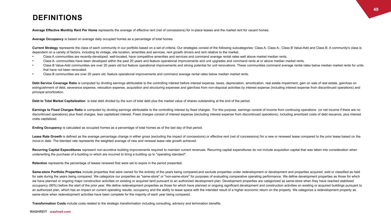 49 WASHREIT washreit.com DEFINITIONS Average Effective Monthly Rent Per Home represents the average of effective rent (net of concessions) for in-place leases and the market rent for vacant homes. Average Occupancy is based on average daily occupied homes as a percentage of total homes. Current Strategy represents the class of each community in our portfolio based on a set of criteria. Our strategies consist of the following subcategories: Class A, Class A-, Class B Value-Add and Class B. A community's class is dependent on a variety of factors, including its vintage, site location, amenities and services, rent growth drivers and rent relative to the market. • Class A communities are recently-developed, well-located, have competitive amenities and services and command average rental rates well above market median rents. • Class A- communities have been developed within the past 20 years and feature operational improvements and unit upgrades and command rents at or above median market rents. • Class B Value-Add communities are over 20 years old but feature operational improvements and strong potential for unit renovations. These communities command average rental rates below median market rents for units that have not been renovated. • Class B communities are over 20 years old, feature operational improvements and command average rental rates below median market rents. Debt Service Coverage Ratio is computed by dividing earnings attributable to the controlling interest before interest expense, taxes, depreciation, amortization, real estate impairment, gain on sale of real estate, gain/loss on extinguishment of debt, severance expense, relocation expense, acquisition and structuring expenses and gain/loss from non-disposal activities by interest expense (including interest expense from discontinued operations) and principal amortization. Debt to Total Market Capitalization is total debt divided by the sum of total debt plus the market value of shares outstanding at the end of the period. Earnings to Fixed Charges Ratio is computed by dividing earnings attributable to the controlling interest by fixed charges. For this purpose, earnings consist of income from continuing operations (or net income if there are no discontinued operations) plus fixed charges, less capitalized interest. Fixed charges consist of interest expense (excluding interest expense from discontinued operations), including amortized costs of debt issuance, plus interest costs capitalized. Ending Occupancy is calculated as occupied homes as a percentage of total homes as of the last day of that period. Lease Rate Growth is defined as the average percentage change in either gross (excluding the impact of concessions) or effective rent (net of concessions) for a new or renewed lease compared to the prior lease based on the move-in date. The blended rate represents the weighted average of new and renewal lease rate growth achieved. Recurring Capital Expenditures represent non-accretive building improvements required to maintain current revenues. Recurring capital expenditures do not include acquisition capital that was taken into consideration when underwriting the purchase of a building or which are incurred to bring a building up to "operating standard". Retention represents the percentage of leases renewed that were set to expire in the period presented. Same-store Portfolio Properties include properties that were owned for the entirety of the years being compared,and exclude properties under redevelopment or development and properties acquired, sold or classified as held for sale during the years being compared. We categorize our properties as "same-store" or "non-same-store" for purposes of evaluating comparative operating performance. We define development properties as those for which we have planned or ongoing major construction activities on existing or acquired land pursuant to an authorized development plan. Development properties are categorized as same-store when they have reached stabilized occupancy (90%) before the start of the prior year. We define redevelopment properties as those for which have planned or ongoing significant development and construction activities on existing or acquired buildings pursuant to an authorized plan, which has an impact on current operating results, occupancy and the ability to lease space with the intended result of a higher economic return on the property. We categorize a redevelopment property as same-store when redevelopment activities have been complete for the majority of each year being compared. Transformation Costs include costs related to the strategic transformation including consulting, advisory and termination benefits.